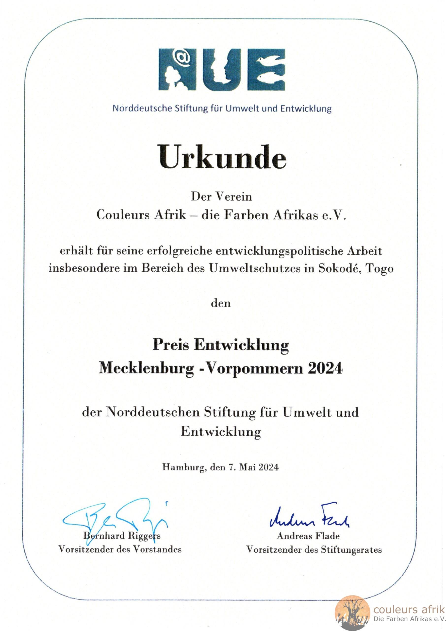 Die Vereine Couleurs Afrik in Schwerin und Espoir Plus in Sokodé/Togo arbeiten seit 2017 gemeinsam daran, armen Menschen durch Arbeit eine Perspektive für selbstbestimmtes Leben zu geben. Seit 2021 werden auch Spendenbrillen aus Schwerin an Bedürftige kostenlos verteilt.